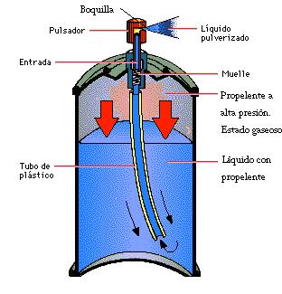- Cuando la mezcla de líquido con propelente sale por la boquilla cambia su presión. El propelente, estando en el interior del bote, se encuentra a alta presión y en estado líquido. Cuando entra en contacto con la atmósfera al atravesar la boquilla, la presión es mucho menor y el propelente pasa a estado gaseoso, pulverizándose de forma que el líquido se esparce en la atmósfera en forma de lluvia.